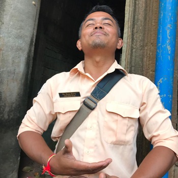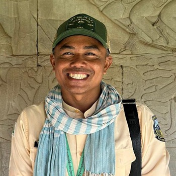 Naga is the youngest of 7 siblings, born in rural Cambodia. Siem Reap province. With the death of his father in 2001, he had to take over his father’s duties growing rice. This at a young after attending school. To advance his education, and in particular to learn English which was his passion, he had to ride 20 kms per day by bicycle for 3 years. His first real job was to look after mental children in the morning and then in the afternoon he was a volunteer teaching English in an NGO school. Working with many foreigners, he was delighted to practice out his English on them. His dedication to improve resulted in passing the exam to be a teacher of English in public school. Furthermore in 2012, he completed his tour guide training. An official qualification awarded by the Ministry of Tourism in Siem Reap. Since then he has worked in collaboration with travel agents and hotels offering his tour guide services. Book Naga as your tour guide in Siem Reap. His friendly smile, passion for learning and interest in others make him an excellent choice.